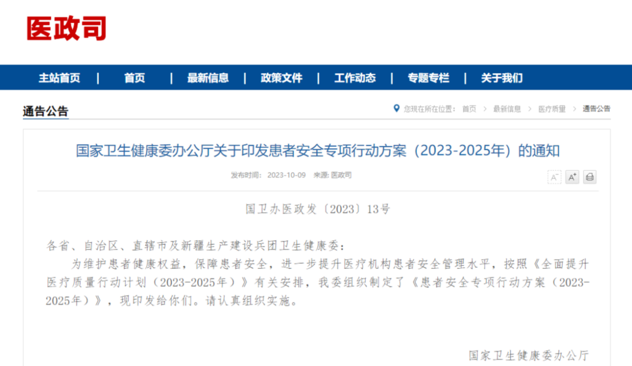 為維護(hù)患者健康權(quán)益,保障患者安全,進(jìn)一步提升醫(yī)療機構(gòu)患者安全管理水平,國家衛(wèi)生健康委制定并發(fā)布了《患者安全專項行動方案(2023-2025年)》(以下簡稱《行動方案》)。